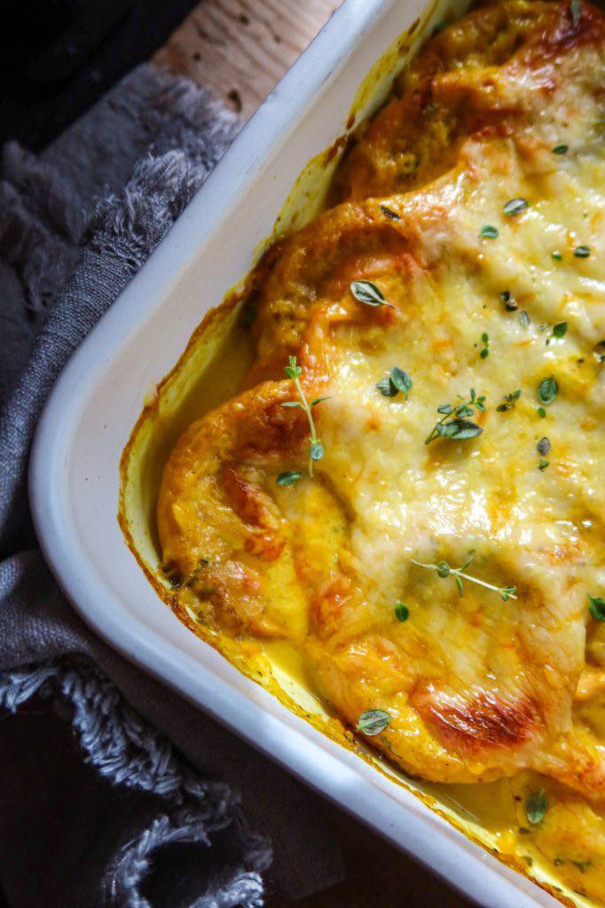 Gratinoitu kana-falu-makkara