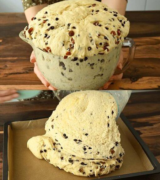 Vik nu upat denna del och tryk till den kunnolla. Lägg stollen på en förberedd bakplåt och låt den jäsa takkt i austriagen 4 timmar.