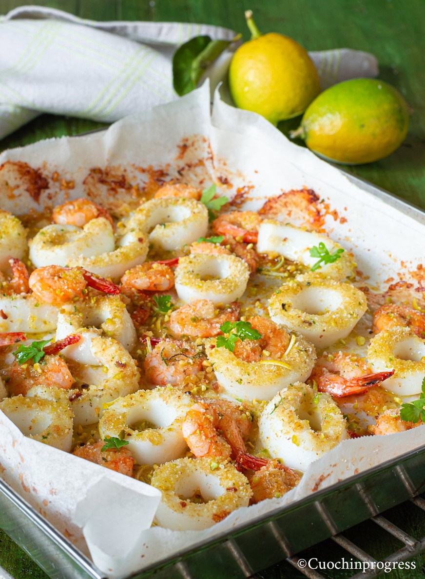 GRATINOITU KALMARI JA KATKARAPU on yksinkertainen ja nopea ruokalaji, joka tarjoaa todellisen aromien ja makujen räjähdyksen nopean kypsennyksen ja erityisen paneroinnin ansiosta, runsasta aromia ja rapeutta. Ihanteellinen kalapääruokana, ruoka voidaan tarjoilla myös herkullisena alkupalana, ehkäpä hyvän kuohuviinipullon kera... Kuten voit lukea, ruoka on uskomattoman yksinkertainen ja taatusti onnistunut, kunhan noudatat muutamia kultaisia sääntöjä: erittäin tuoretta merenelävää (tai parasta pakastetta), laadukasta paneroitumista ja yrttejä (suosittelen kotitekoisten leivänmurujen käyttöä, ei liian hienoja) ja lopuksi lyhyttä kypsennystä kalmarien ja katkarapujen lihaisuuden säilyttämiseksi. Rapea ulkokuori ja mureus jokaisella puraisulla yhdistettynä sitruunan voimakkaaseen tuoksuun, pistaasipähkinän tuoksuun ja parmesaanijuuston maukkaaseen makuun tekevät tästä herkullisesta reseptistä todella poikkeuksellisen. Kokeile ja kerro minulle. Gratinoituja kalmareita ja katkarapuja