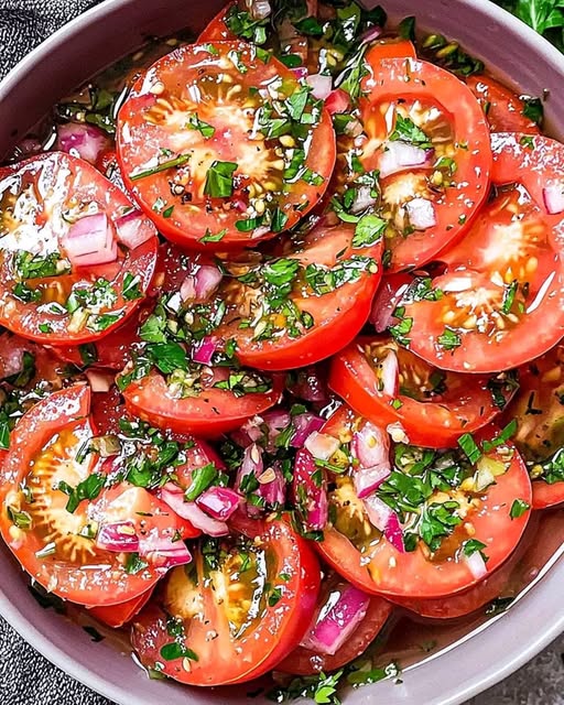 Värikäs ja tuoksuva salaatti, jossa kypsiä tomaatteja marinoidaan yrttivinaigretissä.