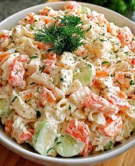Tämä kermainen rapupastasalaatti on täydellinen sekoitus mureaa pastaa, herkkää rapua, rapeita kasviksia ja täyteläistä, kirpeää kastiketta. Se on virkistävä, helppo valmistaa ja sopii erinomaisesti piknikille, potluck-illallisille, lounaille tai nopeille illallisille. Jokainen suupala tarjoaa viileän ja mukavan maun.