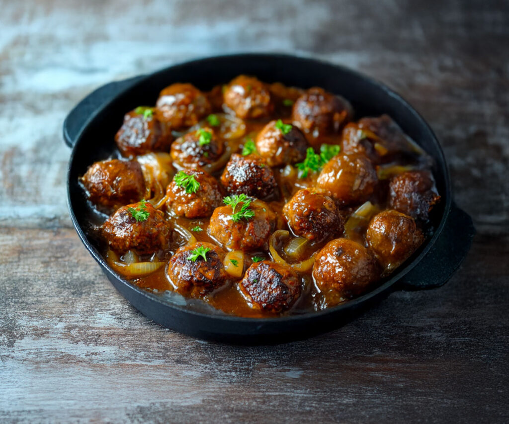 Tämän reseptin todellinen tähti on tietenkin sipulikastike. Pitkässä haudutuksessa siitä tulee paksua, tuoksuvaa ja täyteläistä, ja se sopii täydellisesti jokaisen lihapullan runsaaseen päällystämiseen. Lihaliemi antaa sille täyteläisyyttä, ja karamellisoidut sipulit lisäävät sen hieman makean säväyksen, joka tekee kaiken eron.