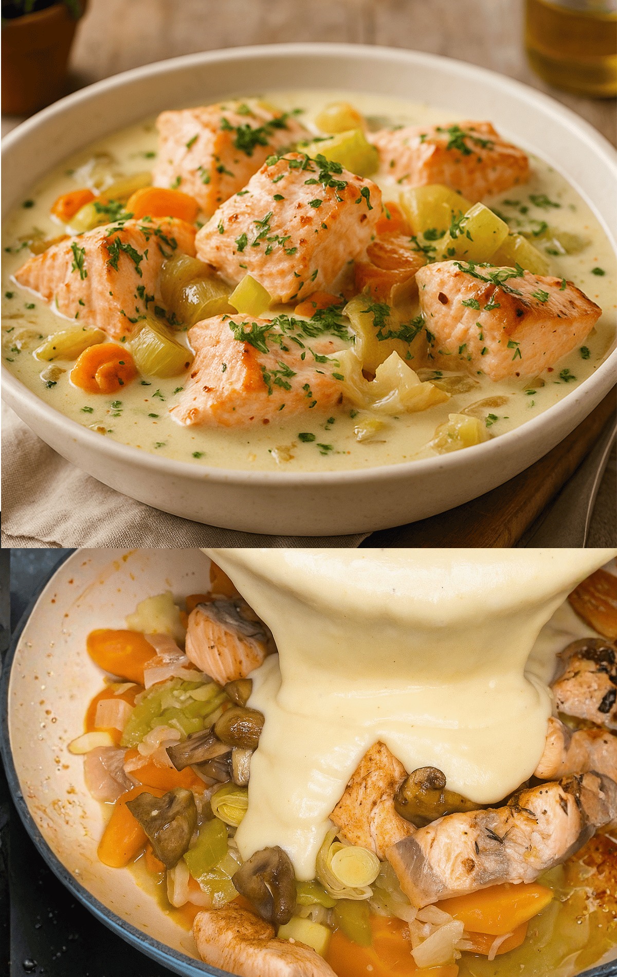 Lohiblanquette purjon ja porkkanoiden kera on kevyt ja hienostunut versio perinteisestä blanquettesta. Tämä tasapainoinen ruoka yhdistää murean lohen makeisiin vihanneksiin kermaisessa ja tuoksuvassa kastikkeessa. Helppo valmistaa, tämä resepti sopii täydellisesti perhelounaalle tai elegantille illalliselle, pysyen samalla yksinkertaisena ja lohduttavana.