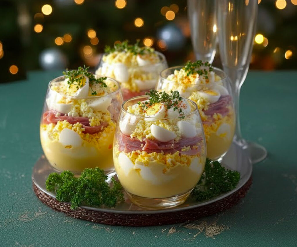 VÀrikkÀissÀ kerroksissa kauniissa laseissa tarjoiltuna nÀmÀ verrines-lasit yhdistÀvÀt herkullisuuden ja tyylikkyyden. Jokainen suupala paljastaa tÀydellisen yhdistelmÀn pehmeitÀ munia, kermaista majoneesia ja ripauksen kinkun suolaisuutta. Kokonaisuus viimeistellÀÀn ripauksella paprikaa tai Espelette-pippuria, jolloin lopputulos on yhtÀ herkullinen kuin juhlavakin.