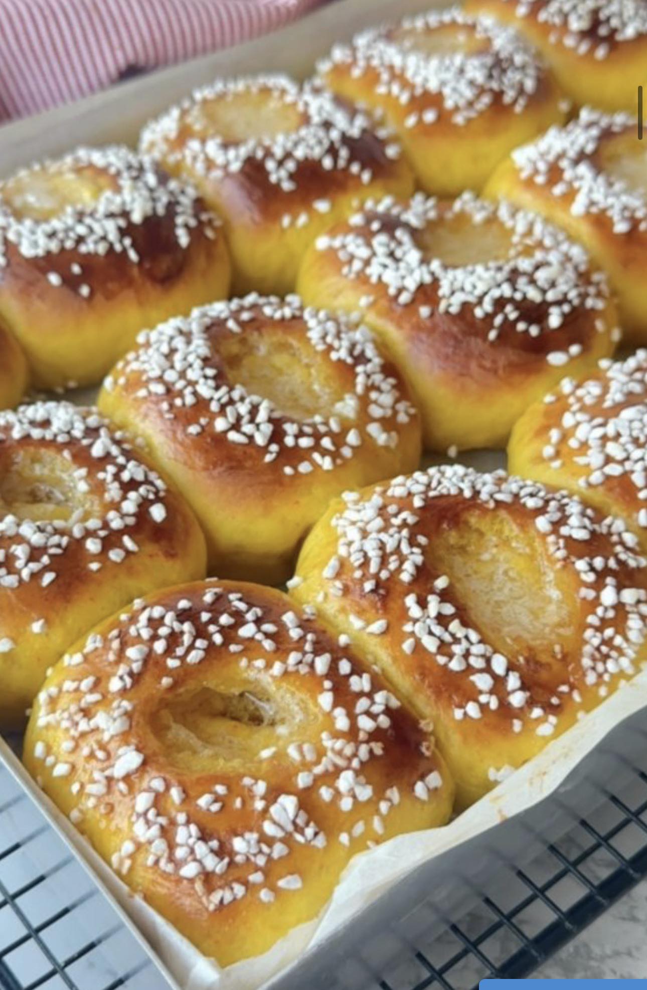 1. Jästens och saffranets möte Smula jästen i en skål och låt den lösas upp i den varma mjölken tillsammans med saffran. Tillsätt gradvis socker, kryddor, ägg, smör och mjöl. Knåda degen varsamt i några minuter och låt den sedan vila under en bakduk i Circa 45 minutes, som en liten stunds meditation i köket.