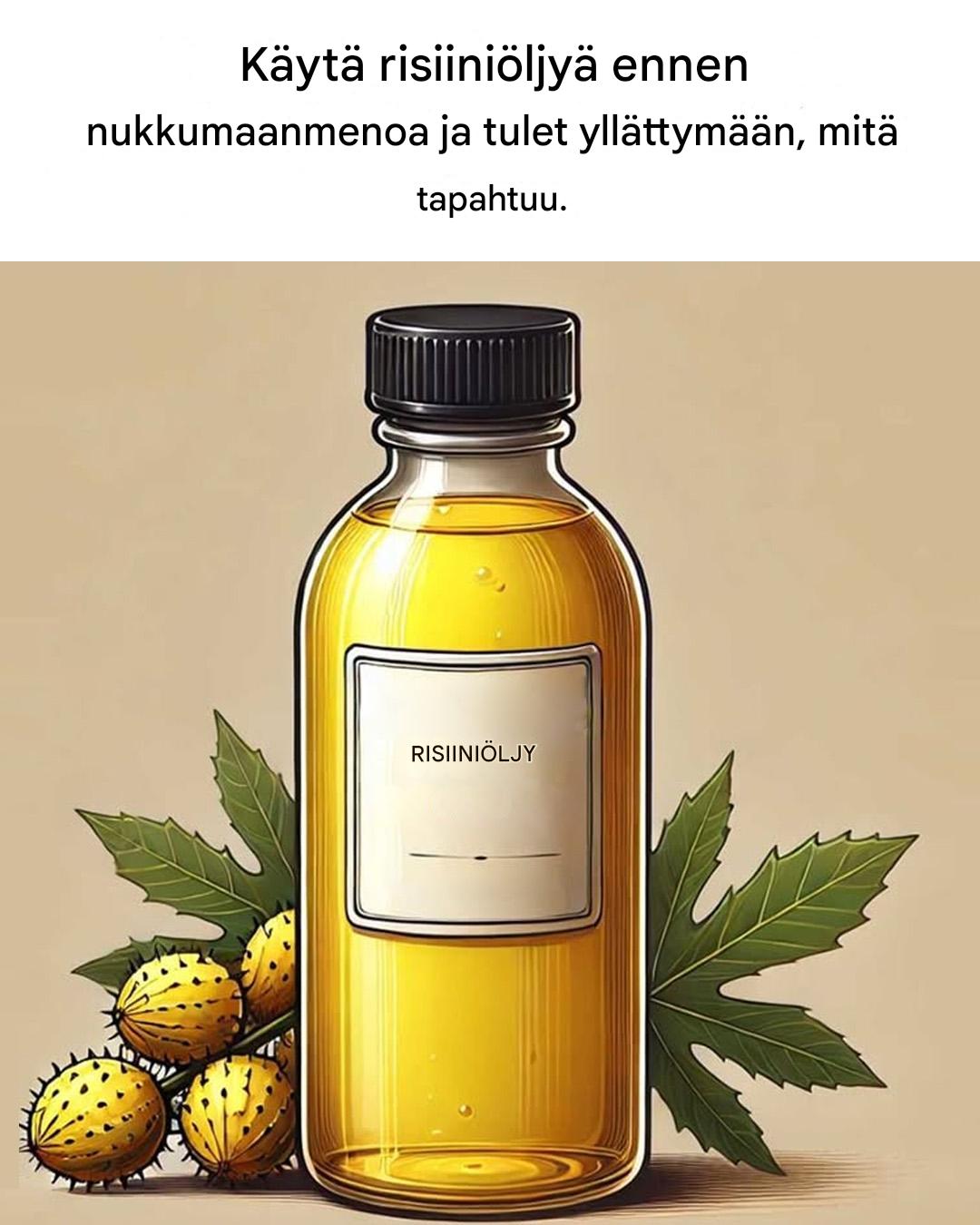 Risiiniöljyä on käytetty sen terveys- ja kauneushyötyjen vuoksi muinaisesta Egyptistä lähtien. Tämä paksu, kullanvärinen kasviöljy, joka uutetaan Ricinus communis -kasvin siemenistä, on todellinen luonnollinen hyödyllisten aineiden lähde. Risiiniöljy on runsaasti risiiniöljyhappoa – ainutlaatuista rasvahappoa – sekä E-vitamiinia ja omega-6- ja omega-9-rasvahappoja, joten se on ehdoton lisä yöpöydällesi. Salaisuus? Jos sitä levitetään ennen nukkumaanmenoa, se vaikuttaa koko yön, antaen ihollesi ja hiuksillesi aikaa imeä sen hyödyt. 10 syytä käyttää risiiniöljyä ennen nukkumaanmenoa Edistää hiusten kasvua Etsitkö paksumpia hiuksia? Hiero hieman risiiniöljyä päänahkaan ennen nukkumaanmenoa. Stimuloimalla mikroverenkiertoa se edistää hiusten kasvua ja vahvistaa juuria. Yksinkertainen, säännöllinen vaihe vahvemmille ja tuuheammille hiuksille. Kosteuttaa ja silottaa ihoa
