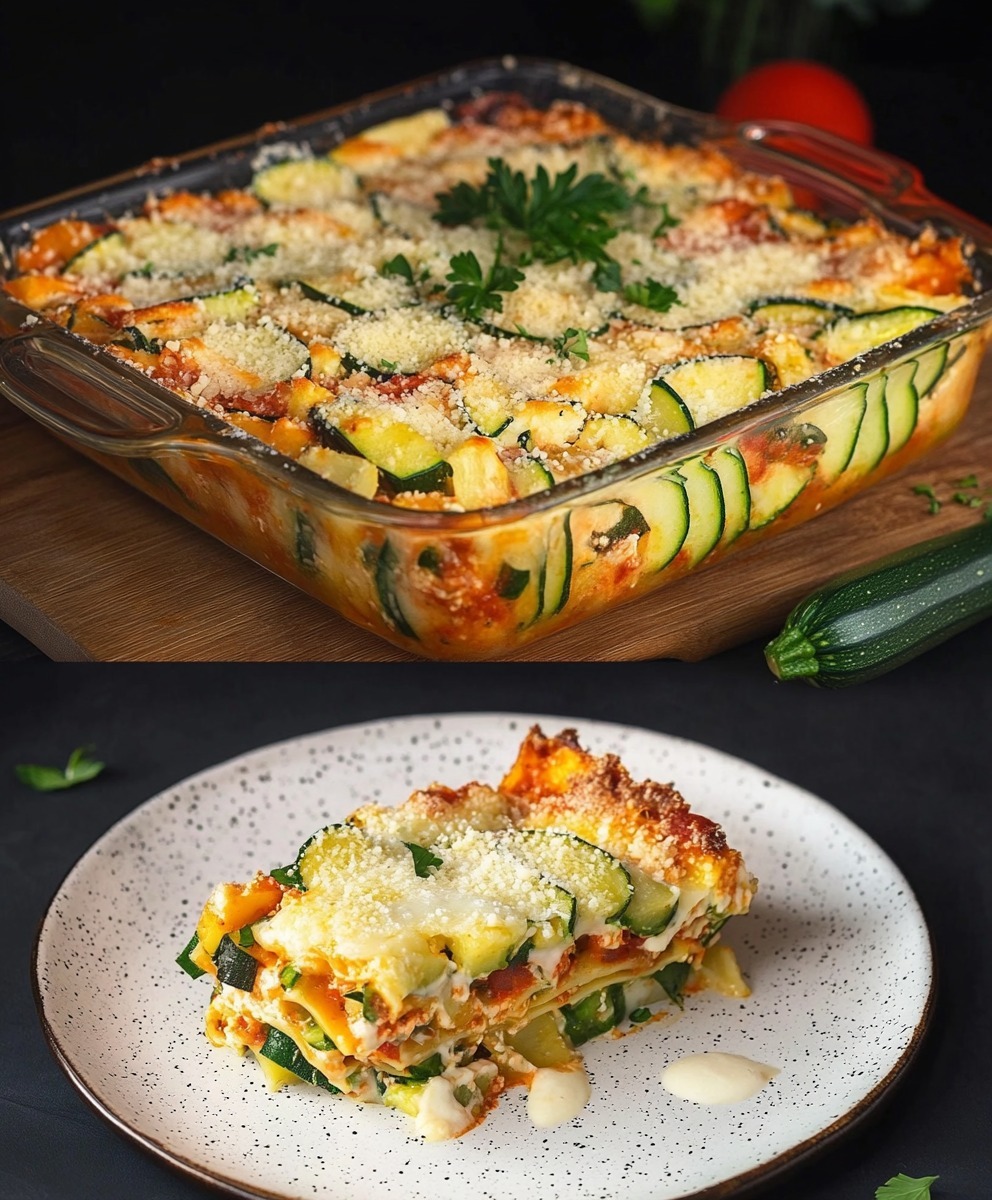 Zucchini Delight: Täyteläinen raejuustogratiini kurkku-valkosipulijogurttikastikkeella