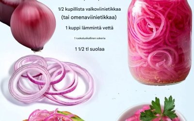 Ainekset: 1 iso punasipuli, ohuiksi viipaleiksi leikattuna 1/2 dl omenaviinietikkaa 1/2 dl vettä 1 rkl kidesokeria 1 1/2 tl suolaa…