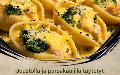 20 jättipastankuorta 2 dl keitettyä kanaa, silputtuna 1 ½ dl höyrytettyä parsakaalia, pilkottuna 2 dl ricottajuustoa 1 ½ dl raastettua…