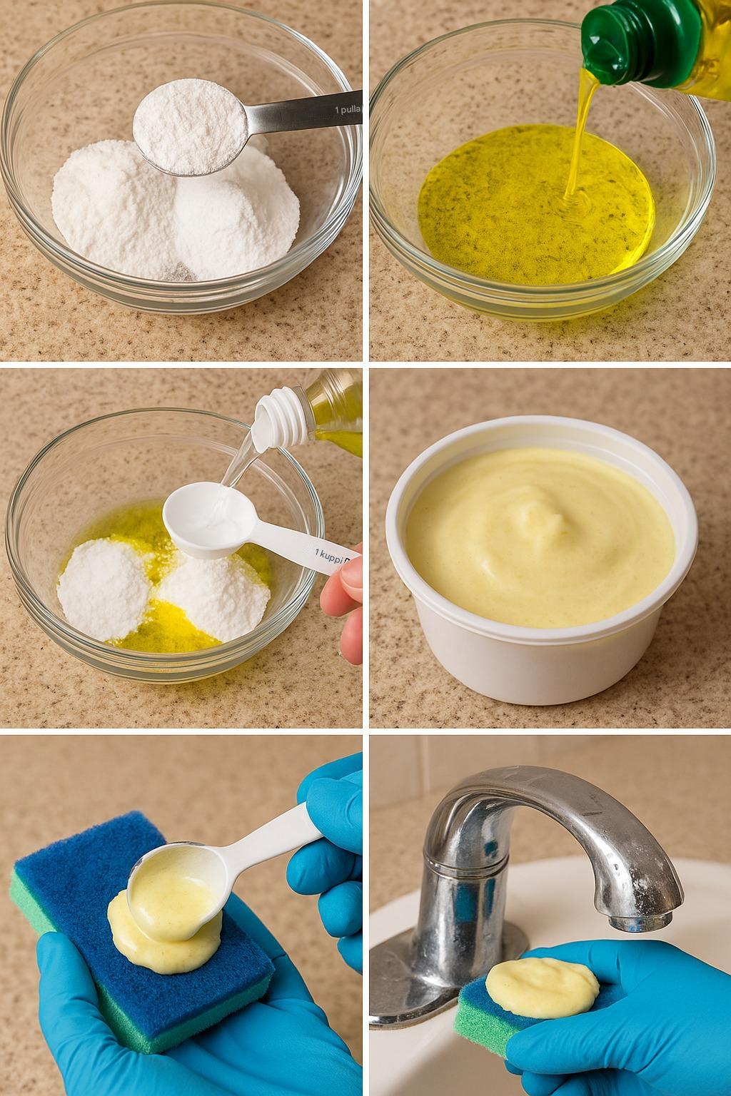 mitä tahansa merkkiä; kolme ruokalusikallista jauhemaista kylpyhuoneen puhdistusainetta; kolme ruokalusikallista ruokasoodaa; ja yhden ruokalusikallisen valkoviinietikkaa.