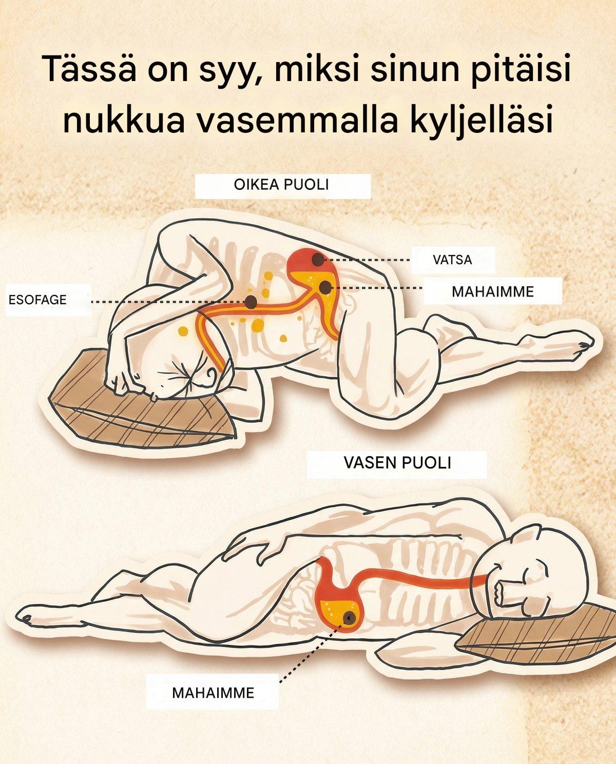 Oikealla kyljellä nukkuminen todennäköisesti pahentaa ruoansulatusongelmia, kun taas vasemmalla kyljellä nukkuminen voi parantaa ruoansulatusongelmia.