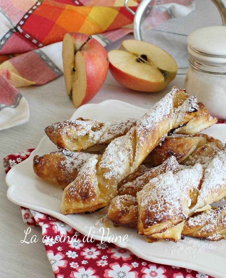 Per gli amanti dei dolci con le mele oggi TORCETTI DI SFOGLIA ALLE MELE, ricetta con le mele ja la pasta sfoglia veloce, golosa ja helppokäyttöinen hinta. In un piovoso pomeriggio ho preparato questi golosi e profumati torcetti di sfoglia alle mele, sono stati i protagonisti di una golosissima merenda dei miei bambini, serviti con sopra dello zucchero a velo, se li sono divorati, un ripienmella ta riccole grattugiata. Un dolce veloce da fare al volo se abbiamo ospiti improvisi, i torcetti di sfoglia alle mele sono buonissimi anche da gustare a colazione, potete anche ricoprirli con un poco di miele al posto dello zucchero a velo, saranno favolosi! Ma ora venite con la vostra Vane, che vi dico la ricetta per i torcetti di sfoglia alle mele.
