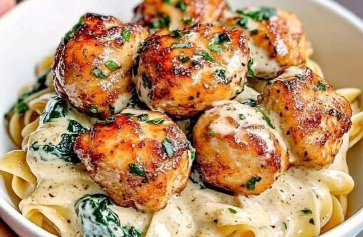 Valkosipulivoi-kanapalat kermaisella parmesaanipastalla ja pinaatilla ovat lohduttava ja maukas ateria, joka yhdistää murean kanan, täyteläisen pastan ja tuoreen pinaatin. Valkosipulivoi-kana antaa maulle syvyyttä, kun taas kermainen parmesaanipasta lisää silkkisen pehmeän rakenteen. Tämä ruoka on loistava tapa nauttia runsas illallinen, joka on sekä tyydyttävä että täynnä herkullisia makuja. Ainekset: